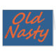 The words "Old Nasty" a spoof on a popular brand of clothing. written in orange letters on a blue background.