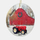 A farmer's favourite red tractor is parked in front of an old red barn in the snow.