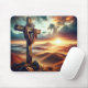 A wooden cross stands atop a rocky hill, with a crown of thorns and draped cloth, overlooking a breathtaking landscape of rolling hills and a vibrant sunrise