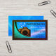 © Sunny Mars Designs. This photography or photographer business card features a graphic vector illustration of a retro rustic SLR camera against a blue grunge abstract background inside a black frame.