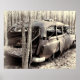 This is part of a collection of photographs I took at Old Car City USA in Georgia. Shown is a 1050s Chevy station wagon in very bad wrecked condition sitting among a grove of trees. This image is in an aged black and white.