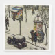 This paper napkin has an old time street scene in the winter covered with snow of an antique car, store fronts, and people shopping.
