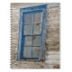 Broken panes and reflections in an old window framed with blue peeling paint and loads of texture
