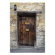 Photo print of an old wooden front door in a stone facade of a house with a light above the entrance.