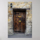 Poster print of an old wooden front door in a stone facade of a house with a light above the entrance.