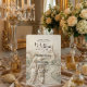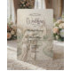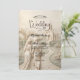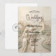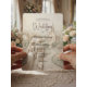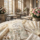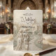 Evoke the timeless elegance of a classical museum masterpiece with this fine art design featuring a romantic couple and chapel in soft neutral cream tones.This design utilizes a sophisticated trompe l'oeil technique to simulate the appearance of an antique bas-relief sculpture. The visual composition features a monochromatic palette of ivory, beige, and warm taupe, creating a soft, dimensional look reminiscent of weathered limestone or plaster. A romantic couple in Grecian-style drapery walks along a cobblestone path toward a vintage church steeple, framed by a garden trellis and climbing roses. The typography hierarchy balances elegant black calligraphy for names with traditional serif fonts for details, set against the faux textured background.This is a flat printed image with a faux stone carving effect, not actual raised material.