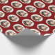 This Christmas wrapping paper features an old world Santa standing in front of two clock towers in a gold circular frame on a deep red background.