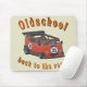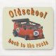 The design features a retro-style red old school van with the number "35" on the front and sides. The bus has a distinctive tuning design with a cut-off roof and a large rear spoiler, giving it a racing and hot rod look. Above it is written "Oldschool" in eye-catching vintage font, while underneath the sentence "back to the roots" underlines the nostalgic character of the design. The colour palette includes warm retro tones such as red, beige, orange and black.