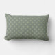Diamond shapes in a light olive colour repeat at regular intervals on a sage green background for this rectangular pillow; very thin stripes in the same shade of olive crisscross the backdrop, framing each diamond, as it were — a neutral yet interesting design that resembles a vintage wallpaper pattern.
