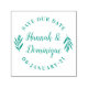 This formal rubber stamp features your names in a calligraphy script font framed by "SAVE OUR DATE", your special date and two elegant olive branches. Customise this classic design by typing your details into the template boxes.