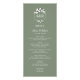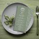 This beautiful olive branch Mediterranean charm green wedding menu card is the perfect way to add a touch of elegance to your wedding. Featuring a graceful olive branch surrounded by a round frame and the couple's initials on a green backdrop, this menu card is a charming addition to the decor of your special day. The reverse side of the menu card is printed with a stunning pattern of the couple's names diagonally placed in white on a green background, creating an eye-catching look. Whether you're having an outdoor or an indoor wedding, this menu card is sure to create a delightful atmosphere that's sure to impress your guests. With its unique and stylish design, this menu card is a perfect way to add a touch of Mediterranean charm to your special day.