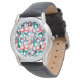 This men's watch has mid-century modern design of circles in blue, teal, pink, purple and berry with white ovals inside.