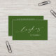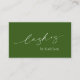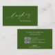 Modern olive / forest green business cards featuring a simple and minimal design with "lashes" in an elegant calligraphy along with your name on the front. The back has your contact info along with social media icons and an optional QR Code in a minimalist layout. The QR Code may be removed and the social media icons may be changed or removed in the design editing tool.