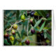 Olives are a Mediterranean delicacy found growing in all the countries that border the Mediterranean Sea and sub-seas. This fruit is typically grown organically, as the olive tree is very sturdy and strong. These green olives are ripening to black as they hang from the branch. This greeting card is fully customisable.