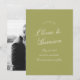 This olive green wedding save the date card blends timeless calligraphy with modern editorial elegance. Designed with refined European estate influence and subtle Island Citrus warmth, it captures Italian countryside romance while feeling fresh and contemporary. The back features your favourite engagement photo for a personal, high-impact reveal. Perfect for the sophisticated bride who loves quiet luxury with a meaningful touch. Pair with olive envelopes or deckled edges for a cohesive suite.
