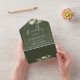 All in one olive green postponed wedding invitation featuring botanical greenery rustic leaves falling across a gold arch enclosing elegant typography. The invitation includes a perforated RSVP card with your wedding website QR code. Designed by Thisisnotme©