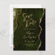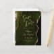 This elegant modern save the date postcard features an olive green watercolor agate background trimmed with faux gold glitter. Easily customise the gold-coloured modern script and sans serif text on the front. On the reverse side, edit the customisable return address and enter your wedding website URL to generate a QR code your guests can scan to learn more about your upcoming event.