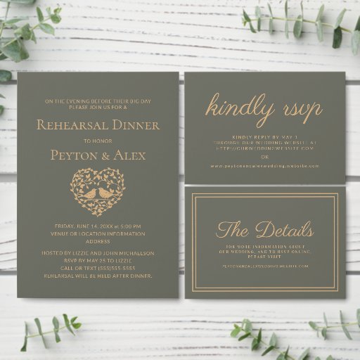 Elegant engagement party invitation with 2 love birds sitting inside a cute, intricately designed heart on an olive green background. Personalised with the names of the bride and groom-to-be and their party information. The background, text, and accent colours of this card are completely customisable to match any colour palette you would like. Contact me for help with customisation and let me help you match your colours.