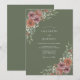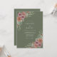 This design features a deep olive green backdrop adorned with lush botanical arrangements. Muted mauve and terracotta dahlias are paired with silvery eucalyptus and delicate white waxflowers. The moody colour palette creates an organic and romantic atmosphere perfect for a rustic autumnal or woodland setting.