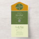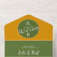 Simplistic, minimalist, modern, contemporary bold bright burnt orange and olive green all-in-one wedding invitation with QR code, monogram with hand drawn love couple birds, trendy handwritten script and custom picture of the at the back.