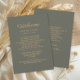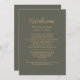 Double-sided olive green wedding welcome letter or itinerary for your guests' welcome bag as they arrive for your wedding weekend. You can add anything to this card that your guests may need. Give them timeline information about the schedule of events for the weekend, information about local attractions they may be interested in, or anything you think they may need to know leading up to and including your wedding ceremony. The background colour of this card is fully customisable so design yours to match your own wedding theme.