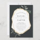 Our elegant botanical Olive Leaf wedding invitation frames your wedding details with a chic gold geometric border, with hand drawn olive leaf illustrations peeking out at the corners. Modern lettering in inky off-black completes the look. Invitations reverse to solid dusty olive green.
