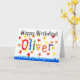 A bright and cheerful birthday card for anyone called Oliver. The letters of the name and the sprinkling of stars are made from handpainted paper collage on a white background. Blank inside for your own message. See also matching mug.