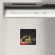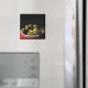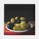 This magnet features a tantalising assortment of delicious olives including Picholine, Nicoise, Kalamata, Green Cerignola and Black Cerignola. They are arranged in a white dish on a colourful woven red, yellow and green mat against a black background for an artistic and mouth watering still life composition.