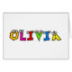Funny cartoon typeface with cartoon eyes spelling out the girls name OLIVIA. Find more names in this series. Easily customise and choose your own background colour. Image available on various gifts and products.