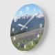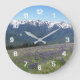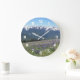 Decorate a living space with this stylish wall clock with white numerals and features a scenic photo image of the Olympic Mountains and meadow wildflowers in Olympic National Park, Washington. Select your clock size and style and size along with hand colour. Use to decorate a living room, dining room, kitchen, bedroom, or any other room.