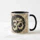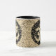 Artsy om symbol on a tan, black marble backdrop with matching black handle and black interior. Meditative.