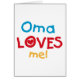 Oma Loves Me T-shirts, cards, stickers, bodysuits bags, and more with colourful red, yellow, and blue text and heart design. These Oma Loves me apparel and gift items will make Oma smile!