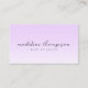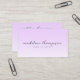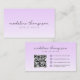 The business card has a soft, elegant design with a light purple gradient background. The name is written in a stylish script font, while the profession and contact details use a clean, modern sans-serif font. The front is minimalistic, displaying only the name and profession. The back includes a QR code and neatly arranged contact icons for easy access. The overall design is sophisticated and well-organised, making it perfect for a beauty or creative professional.