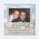 Save the Date magnet announcement with couple's photo, seashells, and sand with their names and the date of the wedding.