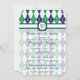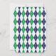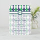 This fun invitation features argyle going 8-bit with this classic navy blue, kelly green, and white colour scheme with a light grey contrast stitch creating a perfect pattern for the golf lover. A white ribbon with navy and green border and matching box hold a monogram set above a lighter section on the lower portion of the card where you can find sample text that you can customise to create a personalised invite for your event.