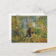 A fine art postcard with the watercolor painting by Winslow Homer (1836-1910) On the Trail (1889). A forest scene of a man hunting with his black and white retriever dog.