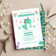 Roar into fun with this cute and colourful “Onasaurus” 1st birthday invitation! Featuring a happy little green dinosaur in a party hat, surrounded by palm trees, bones, and other prehistoric elements, this playful invite is perfect for a dino-mite celebration.