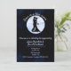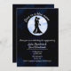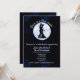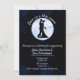 Once in a blue moon themed engagement party invitation done in a dark blue with twinkling stars, on the background. Graphics of a bride and groom silhouette stand in front of a pretty blue moon. Personalise all the text fields to suit your event.