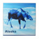 A monochrome (blue) image of a cow moose which walked through my yard in Alaska. Text reading "Alaska" also appears. Moose are year-round residents in many Alaskan communities. Here in Anchorage there are about 1500 animals, along with wolves, brown bears and other wildlife.They are usually well-behaved. They often cross streets at the crosswalks after waiting for a walk signal.