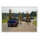 Funny photograph with three giraffe's waling in the middle of the road.