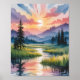 A serene watercolor sunrise over a calm river reflecting pastel pinks, purples, and yellows. Tall pine silhouettes frame layered misty mountains under fluffy colorful clouds, creating a peaceful, uplifting scene of natural harmony and new beginnings.