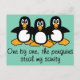 "One by one, the penguins steal my sanity" - 3 cute and funny black and white penguins with orange feet with a silly and humourous saying / quote with a cyan / turquoise background graphic. Change the background colour to your choice. Fully customisable!