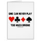 If you feel that you can never play too much bridge and play into the wee hours of the morning in bridge tournaments, you'll enjoy this greeting card featuring the four card suits along with the saying "One Can Never Play Too Much Bridge". Make others do a double-take with a dose of tongue-in-cheek bridge / duplicate bridge style the next time you send this greeting card!