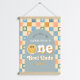 This groovy boys 1st birthday welcome sign captures retro 70s vibes with a cute blue theme, and a pastel chequered pattern. It includes space to add your boys name in a fun script. Perfect for a "One Cool Dude" boho birthday, this playful design adds charm to your little one's special day!