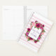 A weekly/monthly planner with an inspirational motivational quote which says: One Day at a Time. Designed with a floral bouquet composed of light pink roses and dark pink poppies with lots of lush green leaves. A frame layered over top with the quoted text inside. The background is a soft pastel pink striped pattern. The back of the planner is a solid pink background.
