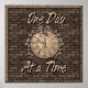 Aged wall with a old clock and the words One day at a time. This slogan is heard throughout the 12 step programs of recovery. This recovery slogan is available on T-shirts, sweatshirts, hoodys in many colours and styles for men and women. Check out the cards, mugs, hats, canvas totes, and gift items available with this recovery slogan.
