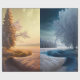 The art featuring one day in winter versus another day in autumn, created in the style of digitally manipulated images, showcase a stunning and realistic depiction of light. The contrasting balance and highly detailed elements come together to offer viewers a visually captivating experience, immersing them in the distinct atmospheres of both seasons.