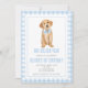 One Golden Year! Preppy puppy golden retriever birthday with blue bow and blue plaid.