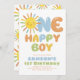 One Happy Boy! A bright and colorful sun themed boys 1st birthday invitation in blue, orange, yellow and green. Available in other colors.