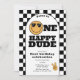 A cute happy birthday invitation design. A cute "One happy dude" happy themed first birthday party invitation. A happy dude themed birthday invitation that can be customized to your details.